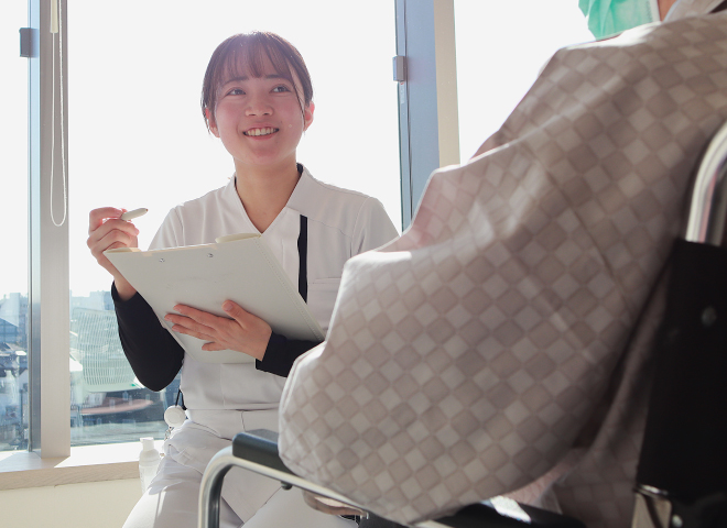 入院時はベッド上で過ごされていた患者様が、手術を受けてリハビリを行っていくうちに徐々に動けるようになって、元気に退院していく姿をみる時に、とても仕事のやりがいを感じます。また、患者様から温かい言葉をかけてもらう時も多くあり、日々患者様からも元気をもらっています。