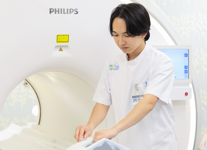 一般撮影部門、CT 部門、アンギオ部門、放射線治療部門を経て現在はMRI 部門にて業務を行なっています。日勤帯では検査前の準備からMRIの撮像、検査に関わる患者様対応、 安全管理等の業務を行なっています。また、1ヶ月に3回程度ある夜勤業務では、救急で受診した患者様の放射線検査全般を行なっています。
