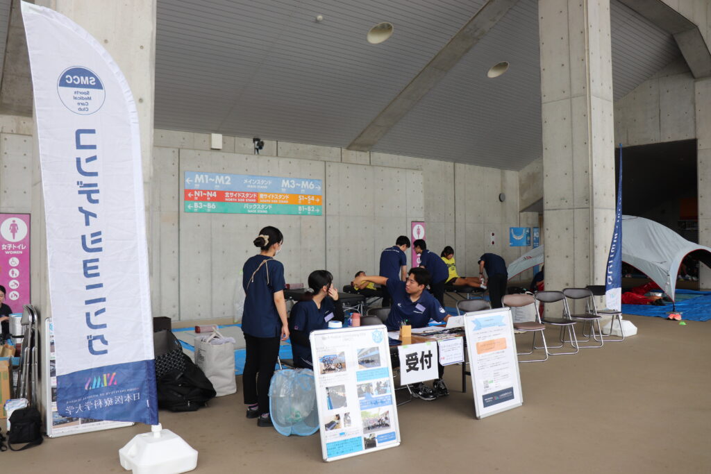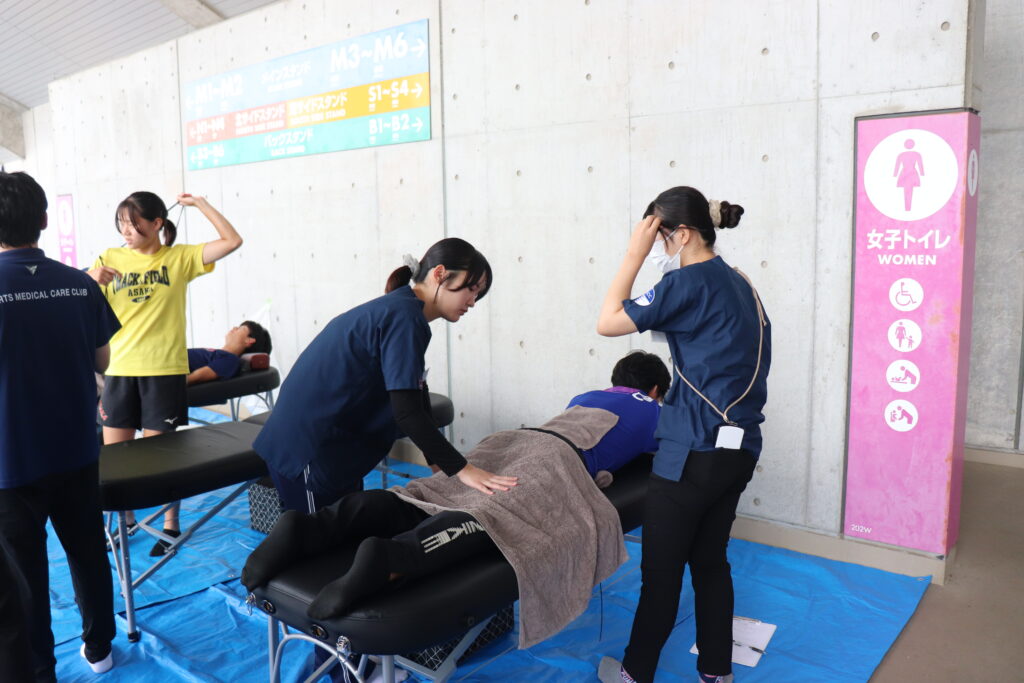 不安定の天気の中、選手のコンディションを整え、満足のいく結果を 残せるよう、SMCC部員がサポートさせていただきました。