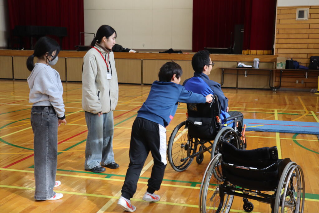 標準型車いす・アクティブ車いす・車いすバスケ用車いす・電動車いす、用途の違う4種類の車いすを実際に乗って操作する体験をしました。