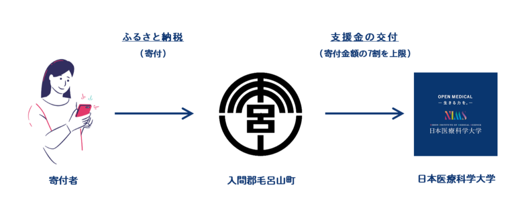 入間郡毛呂山町への当該寄付金は、寄付金額の7割を上限として日本医療科学大学へ交付されます。