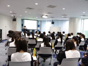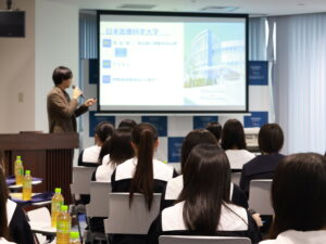 はじめに、本学職員より「大学紹介」と「チーム医療について」、次に医療・基礎教育科より「大学の学び」を聞いていただきました。