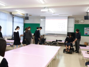 作業療法士の仕事内容や大学での学びについて説明を聞いた後、様々な車イスに実際に触れていただきました。「車いすのクッションでも圧力を軽減できることがわかりました」「パラリンピックでトレーナーとして活躍している卒業生がいることに驚いた」などの感想がありました。
