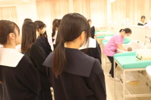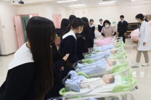 看護学科では、妊婦さんの胎内について説明の後、赤ちゃんのモデル人形を使った抱っこの体験・沐浴などの見学をしていただきました。体験後には「赤ちゃんについて詳しく知れた」「本当の重さの赤ちゃんを抱っこできた」などの感想を聞くことができました。