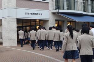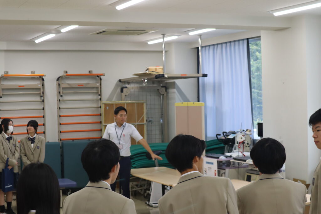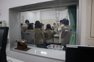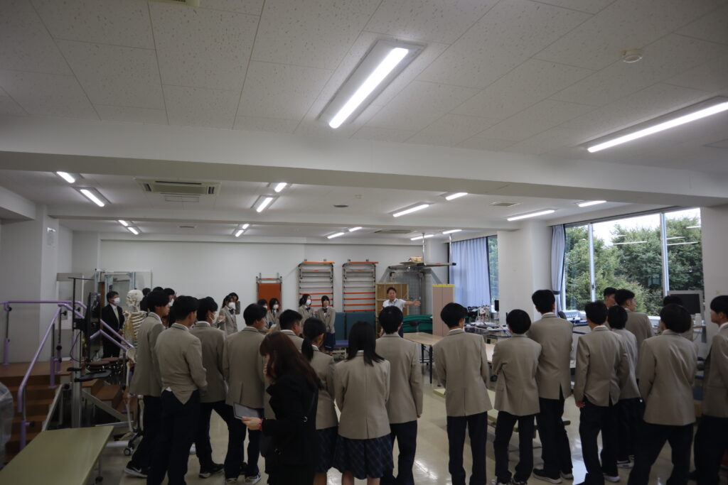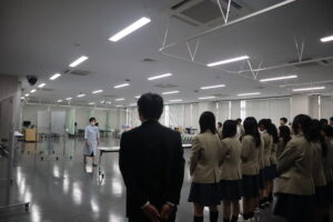 入試広報職員による「大学紹介」と医療・基礎教育科教員の「大学の学び紹介」を聞いていただいた後に、全学科・専攻の実習室キャンパスツアーを行いました。