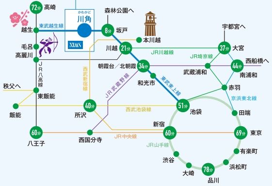 関越自動車道鶴ヶ島インターから約20分/坂戸西スマートインターから約15分